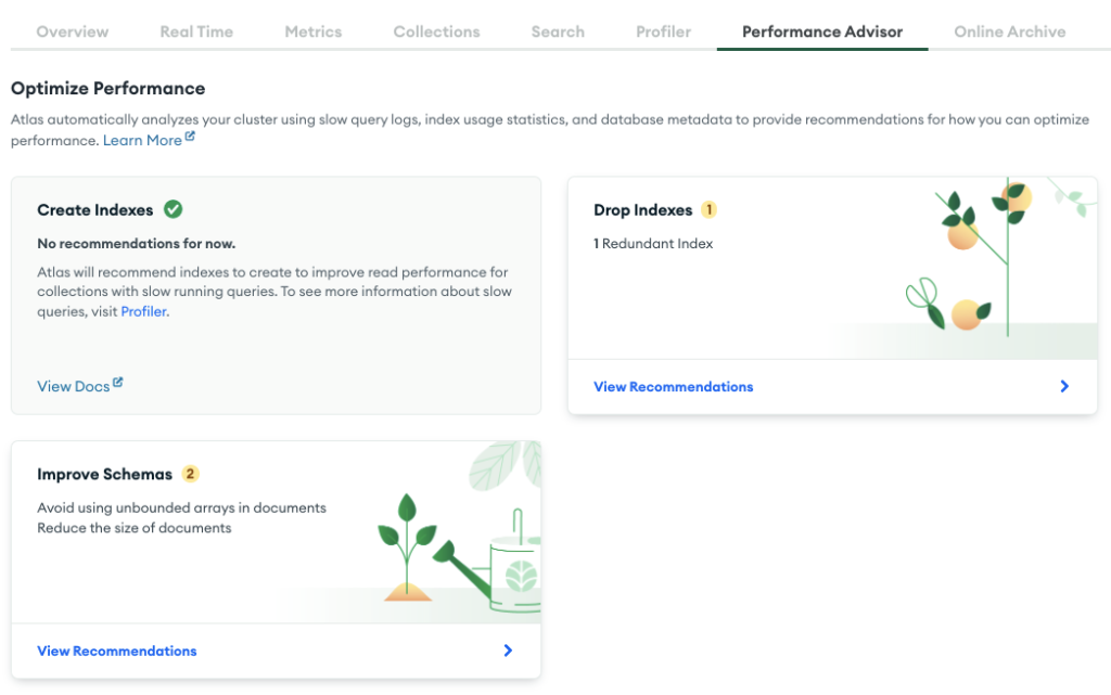 In this case the Performance Advisor suggests schema solutions about adjust the document structure and inspect the document size to improve database performance.