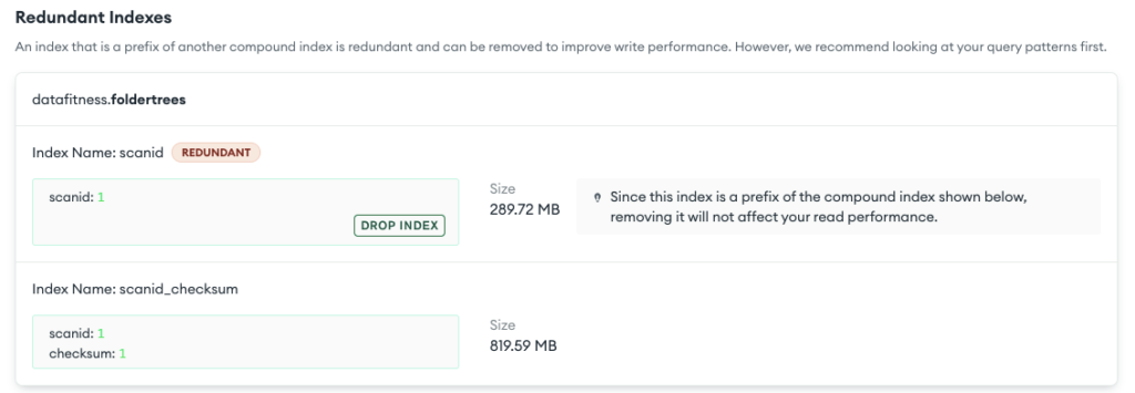 I’ll follow up on these schema improvements later, but first want to focus on the index recommendations. And look, with the introduction of the new scanid_checksum compound index (we need it now for quick document lookup based on checksum over multiple scans), another index that already existed became redundant.