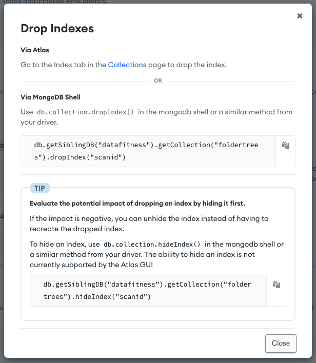 The window that pops up, informs us how we can remove the index either in the Atlas portal, or by using MongoDB Shell, and through the MongoDB drivers. If you don’t feel like dropping the index directly, you can also hide it first as the ( TIP ) explains. In case you want to revert the change, just unhide the index without the need to build it again in case you decide to keep it. A nice addition to make live even more developer friendly in my opinion. To stay aligned with the marine terminology in this post I can state that the modern platform we run on, enables us to focus on shipping features (and yes, we scrub the deck too).